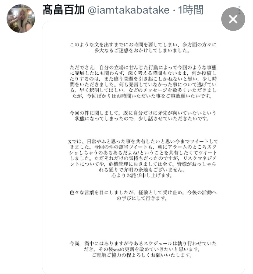 この騒動を受けて、ももかさんは数日後にXで謝罪文を投稿しました。
